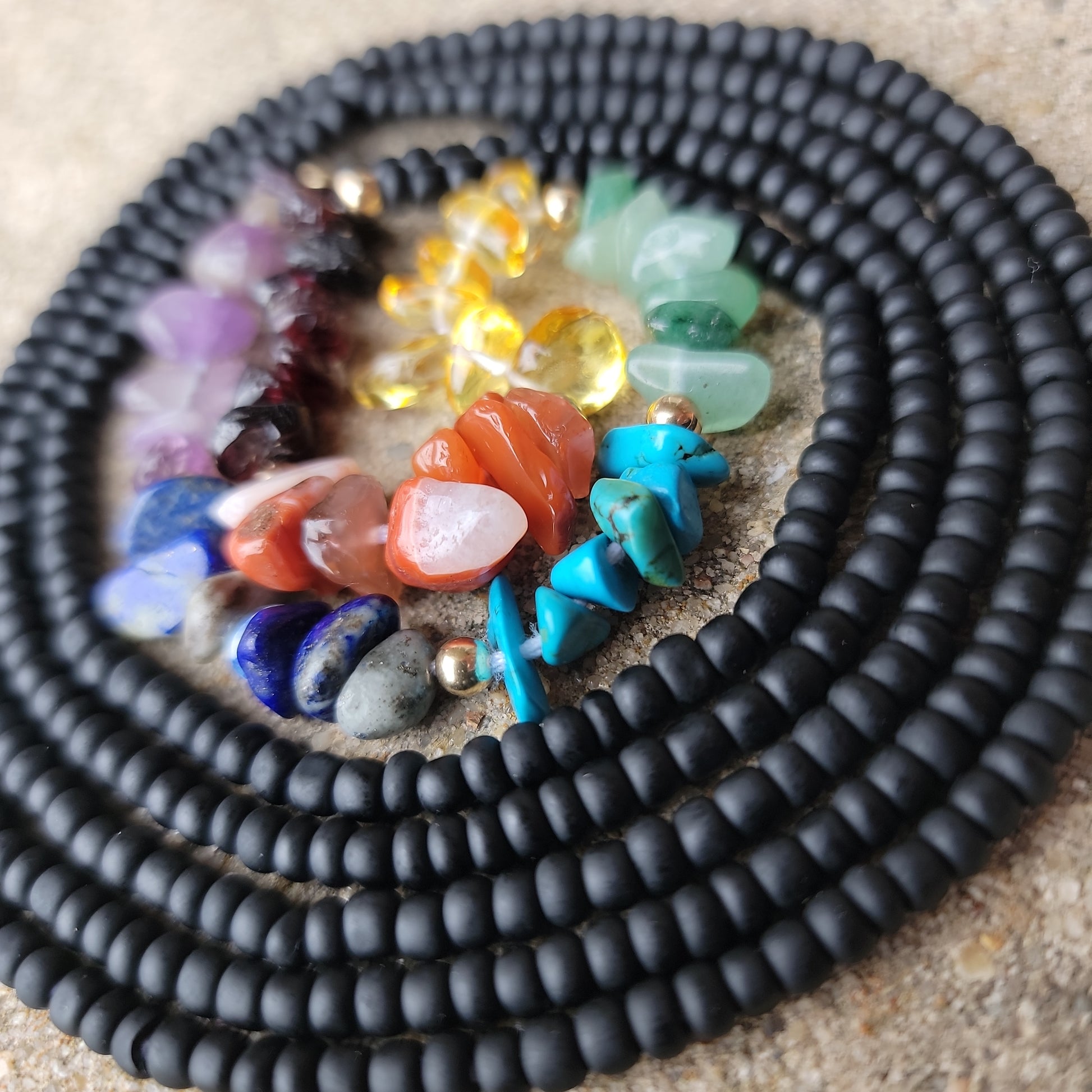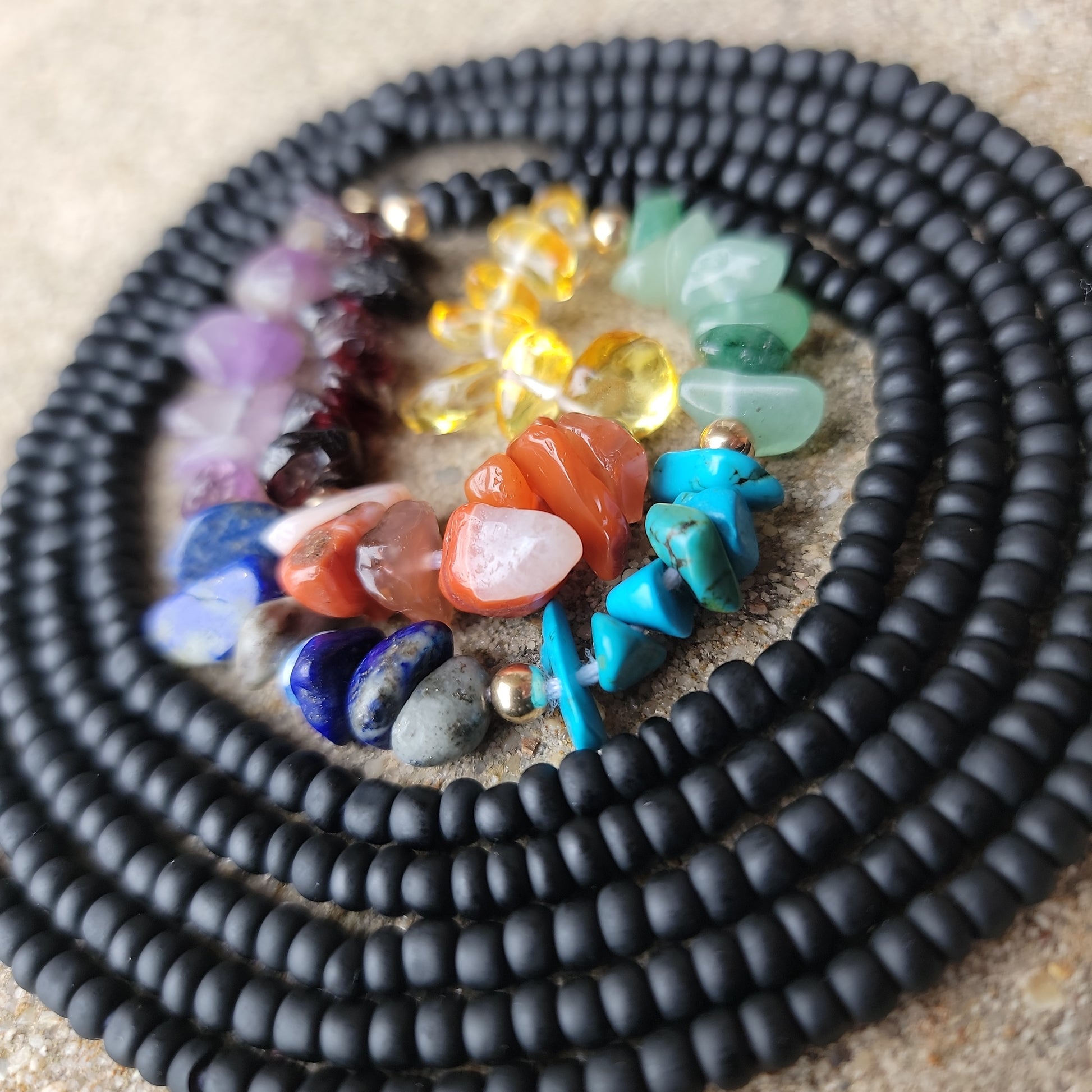 Black glass seed beads with real natural stone Crystals and 14k gold spacers